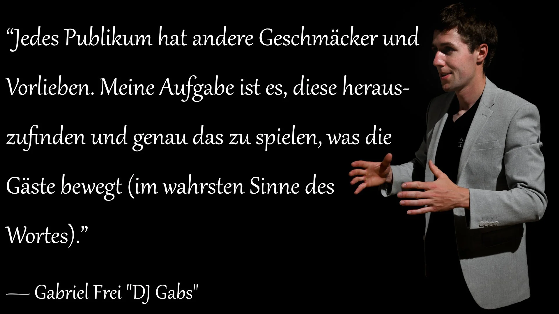 Musikalisch spiele ich (fast) alles, was seit den 1950er Jahren Stimmung macht. Von aktuellen Chart-Hits über legendäre Rock-Songs, die alle kennen, elektronische Rhythmen, welche zur Bewegung auffordern, bis hin zu Evergreens oder Schlager zum Mitsingen.